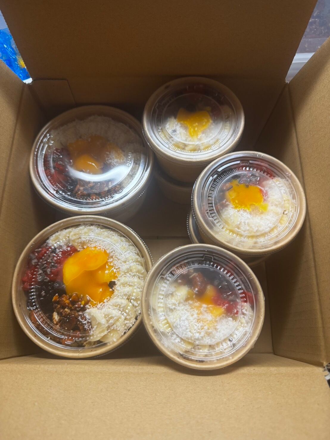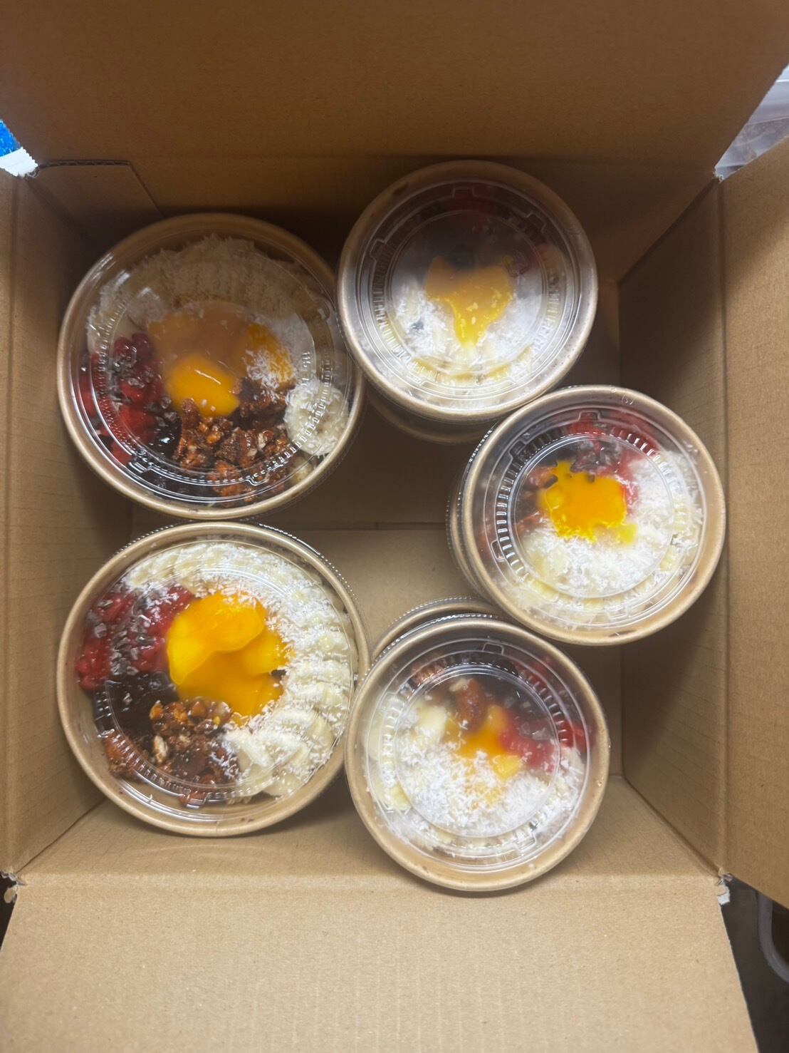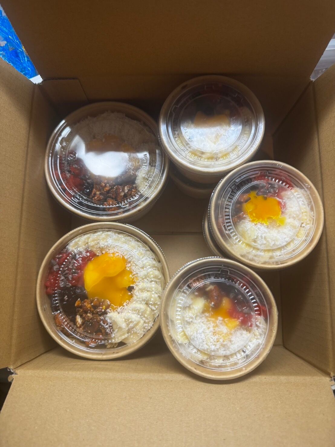 バナナ、ココナッツ、いちご、ワイルドベリー、カカオニブ、マンゴー、マンゴーソース、アーモンドのキャラメリゼ